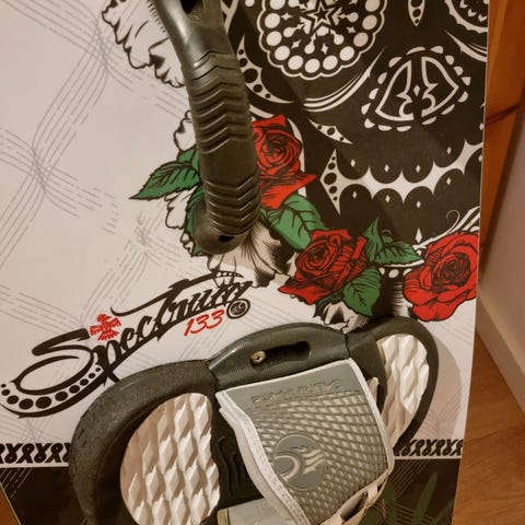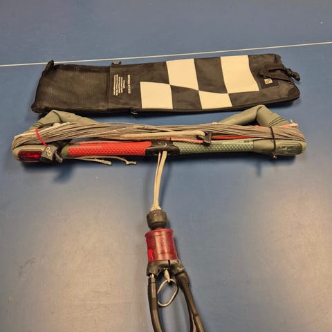 Nesten ubrukt lettvindsdrage. Har ikke rep kit - mistet. Følger med bag, fantastisk Duotone pumpe. En av floaters på baren revnet men bare kosmetisk - se nærbilde. Overdrive trimlite bar (44 - 52).