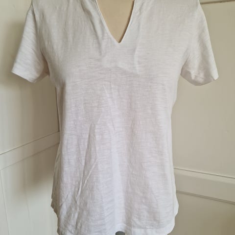 Pen Part Two topp for dame i størrelse S. Toppen er svart med kort erm og V-utringning med liten splitt i halsen. Rett fasong og enkel, ensfarget design. Egner seg godt til hverdagsbruk alene eller under jakker og gensere. Merkelappen er borte, men tror dette er bomull. #tskjorte #tshirt #parttwo