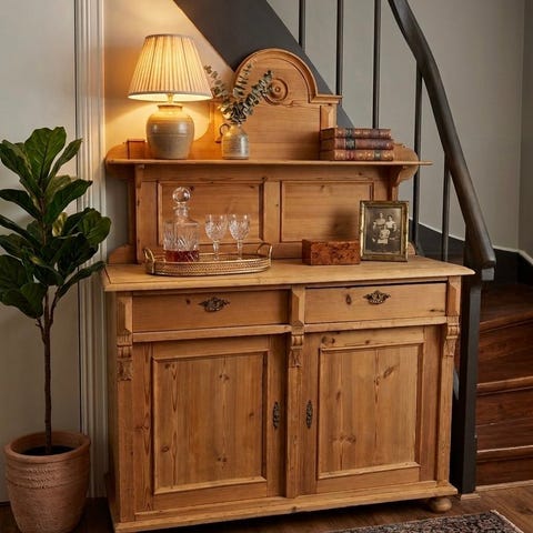 Skrivebordet har furuoverflate, 4 skuffer på høyre side, 1skuff og et skap på venstre side.