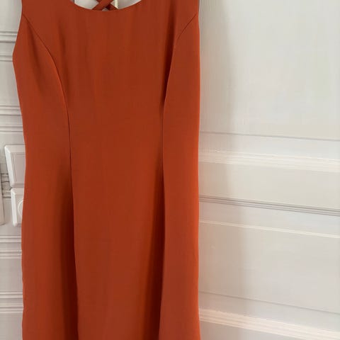 Calvin Klein kjole for dame i størrelse M. Kjolen er rød, ermløs og har tettsittende passform. Den har glidelås i ryggen og skulderstropper med utskjæringer ved halsen. Egnet til bruk ved formelle anledninger, selskaper eller andre situasjoner der en enkel og klassisk kjole ønskes.