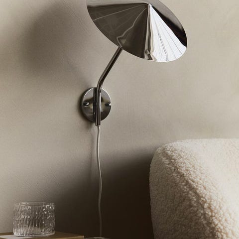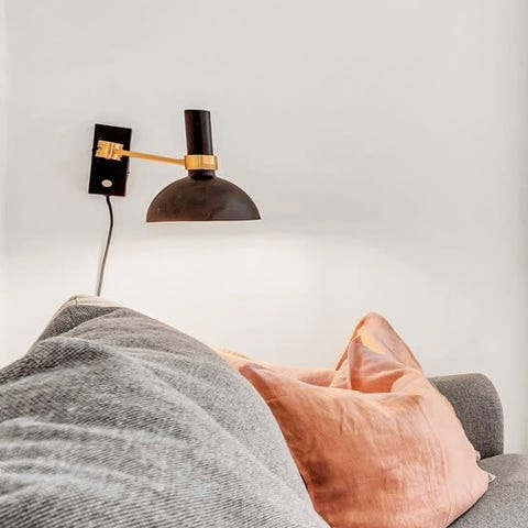 Stilren og funksjonell vegglampe med svingbar arm. Perfekt som leselampe ved seng, sofa eller skrivebord. Lampen har et moderne industrielt uttrykk med svart metall og kobberfarget innside som gir et varmt og behagelig lys.