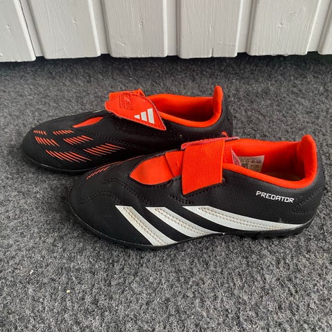 Adidas Predator fotballsko for barn i hvit og rød med svarte striper. Knotter tilpasset kunstgress/gress med lavt mønster. Snøring i front og syntetisk overdel. Str 35