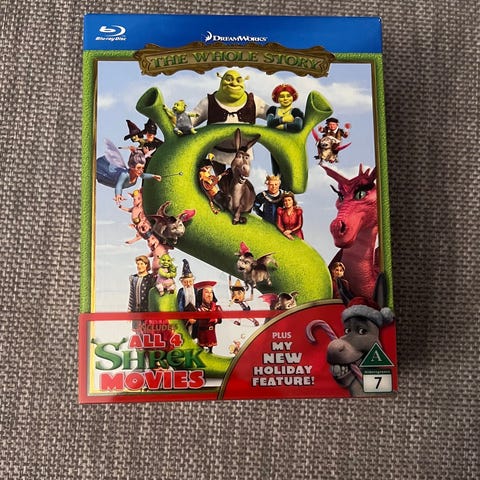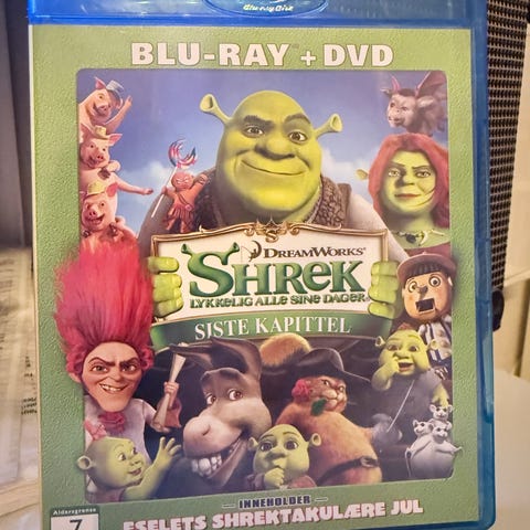 DreamWorks Shrek – Lykkelig alle sine dager Blu-ray + DVD. Pakken inneholder spillefilmen på både Blu-ray og DVD. På omslaget fremgår det også at utgivelsen inkluderer bonusinnhold knyttet til Shrek-universet. Filmen er merket med aldersgrense 7 år. Egnet for avspilling på Blu-ray-spiller og DVD-spiller som støtter regionen utgivelsen tilhører.