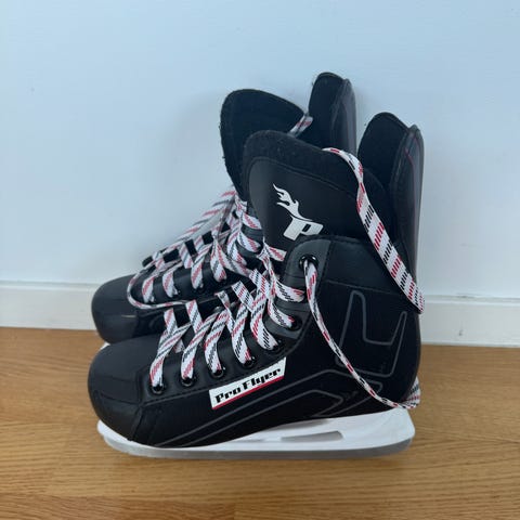 Pro Flyer ishockeyskøyter i svart med hvit skøytestål og såle. Modellen er laget for ishockeybruk, med høy ankelstøtte og snøring foran for justering av passform. Egner seg til bruk på isbaner og skøytebaner. Størrelse er ikke oppgitt og bør kontrolleres ved interesse.