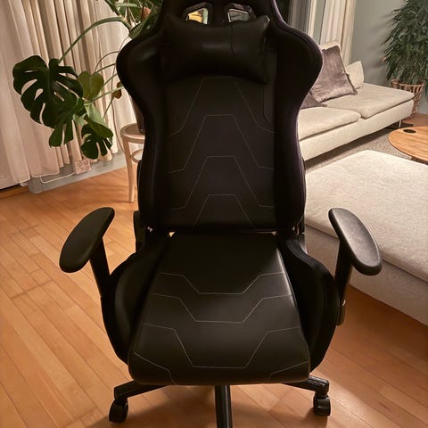 Gamingstolen/Kontorstolen er svart med høy rygg og hjulunderstell. Passer til hjemmekontor, gaming eller annet arbeid ved PC.