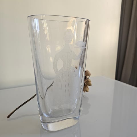 Vintage vase med motiv av et dansende par. Inngravert initialer bak på glasset. Mener det er bokstavene LMS.