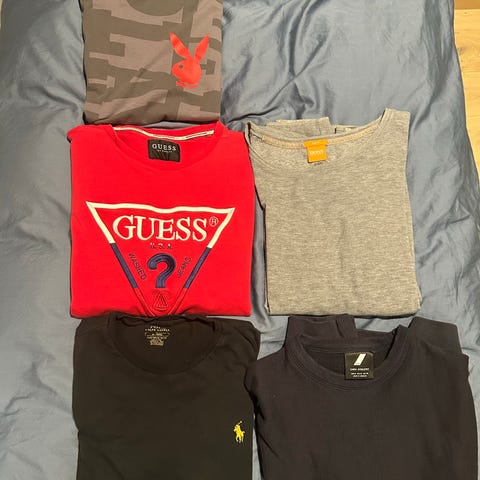 Selger en sekk med ulike merkeklær. 13 stk gensere, 8 stk t-skjorter, 2 stk shorts og 3 stk jeans. Noe er godt brukt, - noe er veldig lite brukt.
