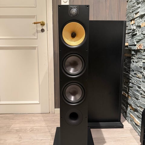 Bowers & Wilkins gulvhøyttaler i hvit utførelse med mørk frontgrill. Høyttaleren er konstruert som en slank søylemodell som plasseres på gulv. Egner seg til bruk i hjemmekino eller stereoanlegg, og kobles til forsterker eller receiver med høyttalerkabler på baksiden. Designet gir et nøytralt uttrykk som passer inn i de fleste stuer og lytterom.