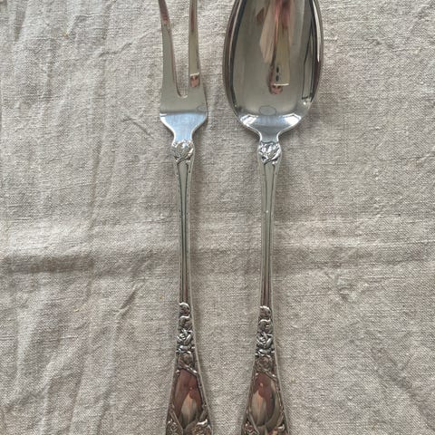 Gaffel 16.5 cm og skje 17.5 cm. NM 40. 2 små flekker på bakside av gaffel. Nostalgisk.