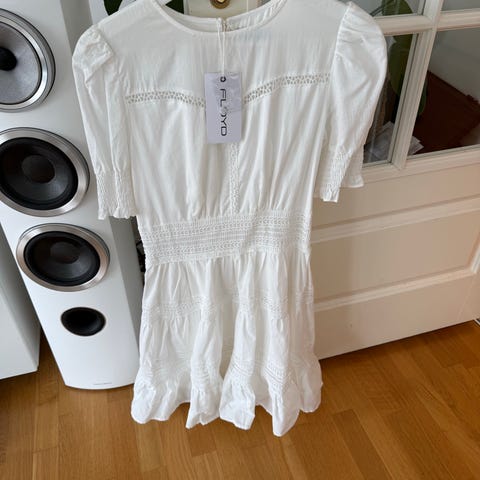 Floyd sommerkjole i bomull for dame i størrelse XS. Lang modell med flerfarget mønster i lyse toner. Kjolen har korte ermer, markert liv og flere volanger i skjørtet. Broderie anglaise-inspirert stoff med hullmønster og dekorative blondedetaljer. Knapp i bakken for lukking. Egnet til bruk på varme dager, til hverdags, fest eller pyntede sommeranledninger ☺