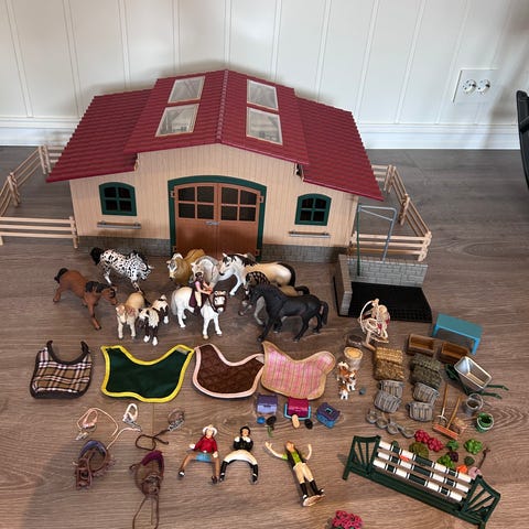 Kan også hentes. Schleich hestestall lekesett i plast. Stallbygningen har rød takfarge, flere bokser med grinder og dører som kan åpnes, samt detaljer som fôrrom og stallutstyr. Med følger hestefigurer, rytterfigur og små tilbehør som høyballer, frukt og bøtter. Lekesettet er egnet til rollelek med hester og stallmiljø innendørs på gulv eller bord.