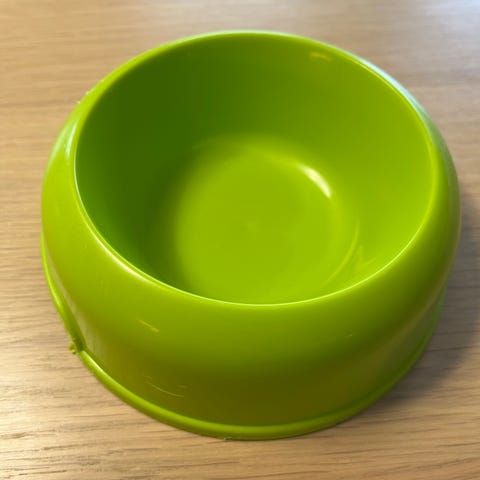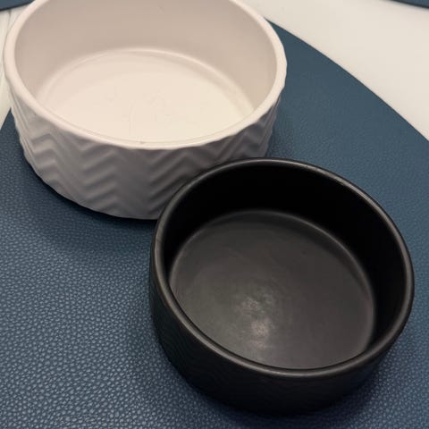 Keramikkskålene står stødig og egner seg til både fôr og vann. Vannflasken festes i bur med medfølgende krok og er beregnet for smådyr. Materialer er keramikk i skålene og plast/metall i vannflasken. Litt gnagd på siden av mat skålen.