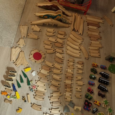 BRIO togbane i tre med diverse tilbehør. Pakken inneholder rette og buede skinneelementer, vekslere og kortere skinner i tre. I tillegg følger det med flere tog, vogner og kjøretøy, samt ulike tilbehørsdeler som bygninger, broer og figurer.
