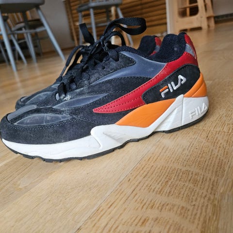 Fila sneakers joggesko i størrelse 38. Modellen har overdel i tekstil og syntetisk materiale i beige og gråtoner med oransje detaljer. Kraftig, hvit yttersåle i gummi gir stabilitet og godt grep. Snøring foran for justerbar passform. Passer til hverdagsbruk og lett fritidsaktivitet.