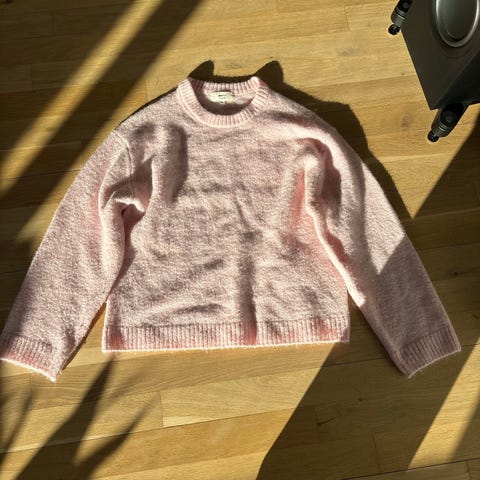 Ganni genser for dame i størrelse S. Genseren er rosa med melert struktur og rund hals. Den er strikket i ullblanding/alpakka, med ribbekanter ved hals, ermer og nederkant.