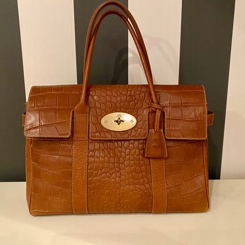 Mulberry vintage skinnveske for dame i brunfarget lær. Vesken har strukturert overflate med preg som minner om krokodillemønster og doble skulderstropper i samme materiale. Den lukkes med karakteristisk Mulberry-spenne i metall på fronten og har glidelåsdetaljer i metall på sidene. Innvendig har vesken fôr med Mulberry-mønster og en innvendig lapp med Mulberry-logo i lær og metall pluss en glidelås innerlomme. Passer som håndveske eller skulderveske til daglig bruk.