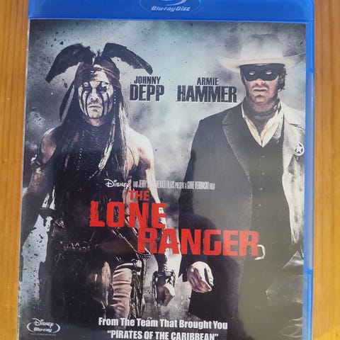 Disney The Lone Ranger Blu-ray film. Spillefilm utgitt på Blu-ray-format. Omslaget viser hovedrollene og original tittel. Egnet for avspilling på Blu-ray-spillere som støtter standard Blu-ray-plater.