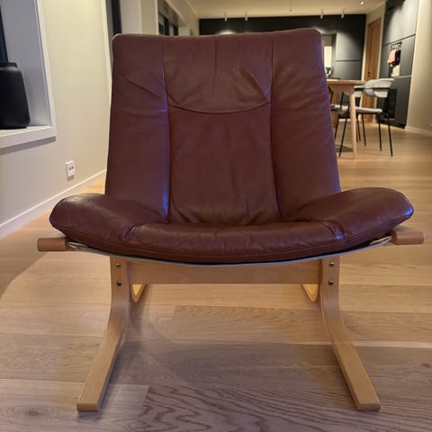 Lenestol fra Hjort Knudsen selges. Stolen kommer med fotskammel. Ryggen kan legges bak. Stolen er brukt, men i fin stand