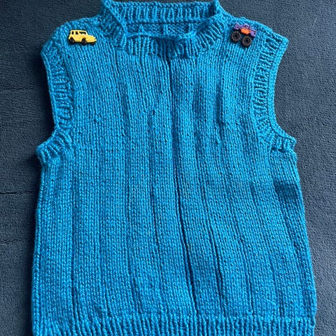 Vesten er strikket etter oppskriften «Lavender smiles» av Drops design, i størrelse 2 år.