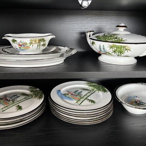 Dekoren heter "Portman" og har et gulltau-bånd, en gullblomsterkrans og gullaksenter rundt kanten.