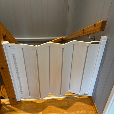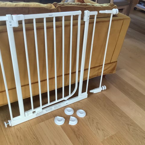 Sikkerhetsgrind fra Yngri med ekstra forlengerdel. Kan justeres i bredden (vi har brukt den i trappeåpning på 95 cm). Lett og rask å åpne for de voksne.