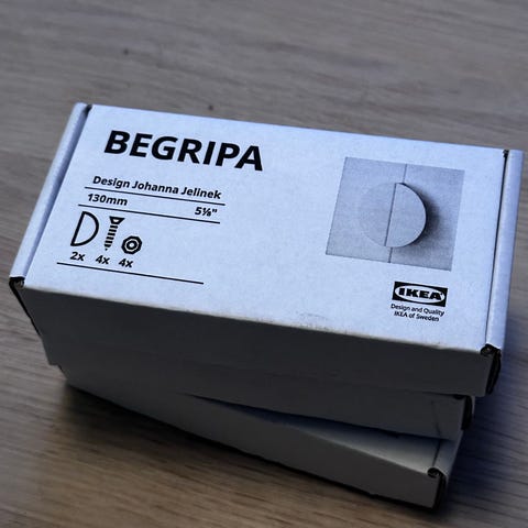 Ikea håndtak Järnsparv. Tre pakker med to håndtak i hver. Ca 10 cm. Se beskrivelse på bildet, eller søk på ikea. Pakkene er ikke åpnet. Selges helst samlet. 150 kr for alle.