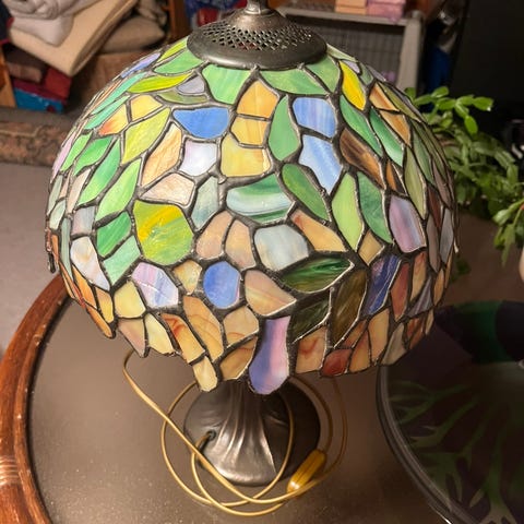 Selger en nydelig Tiffany bordlampe med klare farger i glass skjermen.