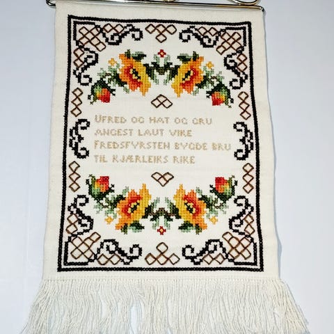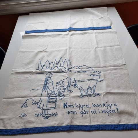 Eldre brodert åkle / pyntehåndkle. Selges uten stativet det henger på på bildet. Noe slitasje/småflekker i stoffet (se bilder). Bredde: ca 54 cm. Total lengde: ca 102 cm, men skal henge delvis brettet, så da blir lengden/høyden ca 80 cm