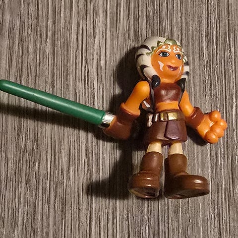 Star Wars figur med lyssabel. Figuren har rød hudfarge, stripete hode/hår i grått og hvitt, samt mørke klær. Den holder et blått lyssverd i høyre hånd. Undersiden er merket «Made in China» og årstallet 2008. Egner seg som samlefigur eller lekefigur for barn som liker Star Wars-universet.Denne figuren er Shaak Ti, en Togruta Jedi-mester fra Star Wars-universet. Dette spesifikke leketøyet er fra Star Wars: Galactic Heroes-serien produsert av Hasbro.