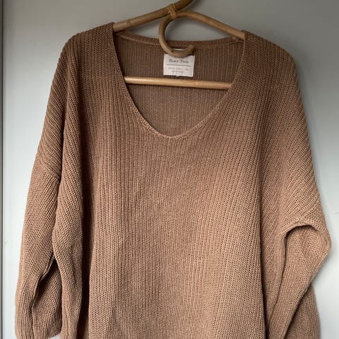 Part Two genser for dame i størrelse S. Genseren er strikket i lin og har en gyldenbeige farge. Modellen har rund hals, 3/4-lange ermer og rett fasong. Strikkestrukturen er grov og luftig, og kanten nederst har små splitter i sidene for bedre bevegelse. Lite brukt.