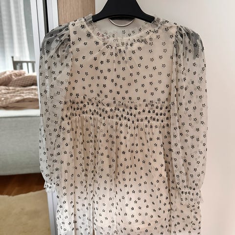 Zara bluse for jente i størrelse 86. Langermet modell i hvit bomull med små prikkemønster. Rund hals med knappelukking foran og rynkedetaljer øverst. Passer til hverdagsbruk eller mer pyntede anledninger for små barn.