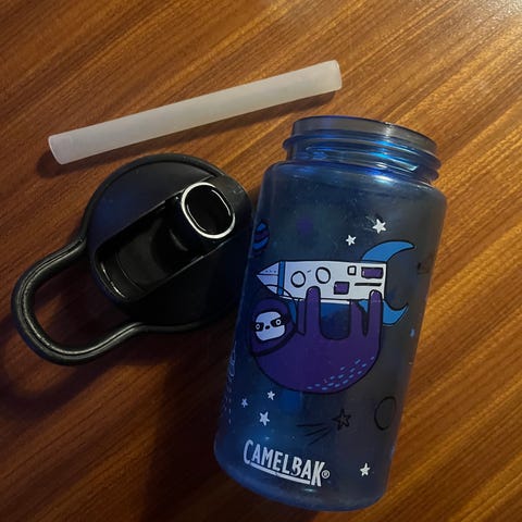 Brukte flasker i stål fra Camelbak, følger med ekstra sugerør til hver flaske, to av tuttene er byttet ut nylig, mens den tredje må mest sannsynligvis byttes ut. Slitt på undersiden.
