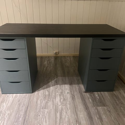 Har 2 kontorpulter med arkivskap på hjul og braketter for å feste PC i slik at den kommer opp fra gulvet. Det er også lagt opp med ekstra strømuttak og for å koble til internett.