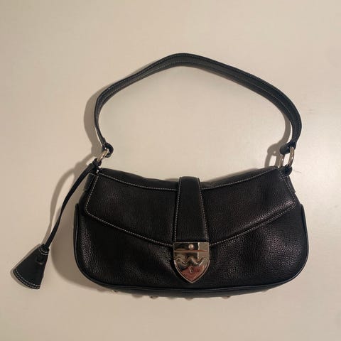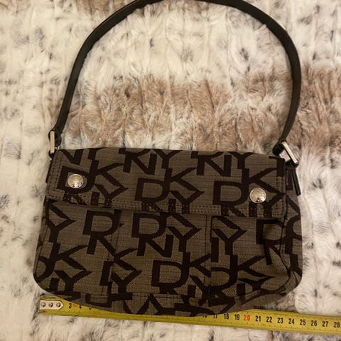 DKNY skulderveske i stoff for med skinn og gulldetaljer. Meget lite brukt, perfekt til en tur på byen med magnet lukking.
