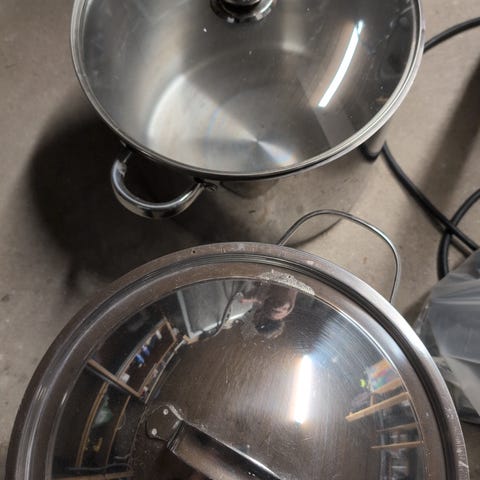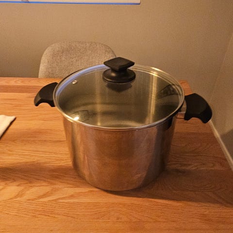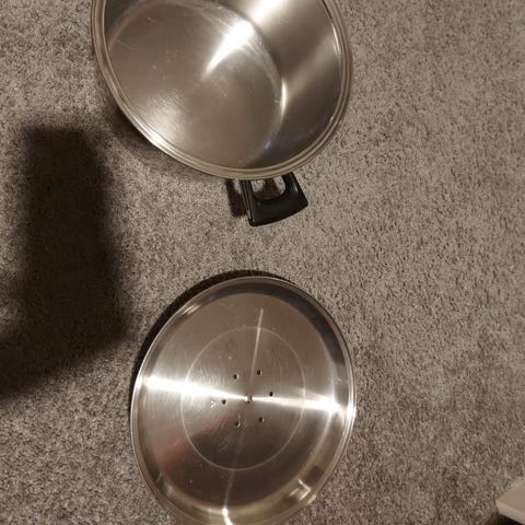 Gryte i rustfritt stål med glasslokk. Gryten har rette sider og to sidehåndtak i metall. Innsiden er glatt og uten belegg. Glasslokket har metallknott. Egner seg til koking av større porsjoner mat. Kan brukes på vanlige komfyrtopper.