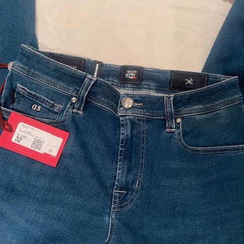Jacob Cohën PW688 COMF jeans i blå farge, størrelse W32 og herremodell M. Laget i Italia med materialkode 8291. Jeansene har knappelukking og lekre detaljer som det klassiske skinnmerke bak.