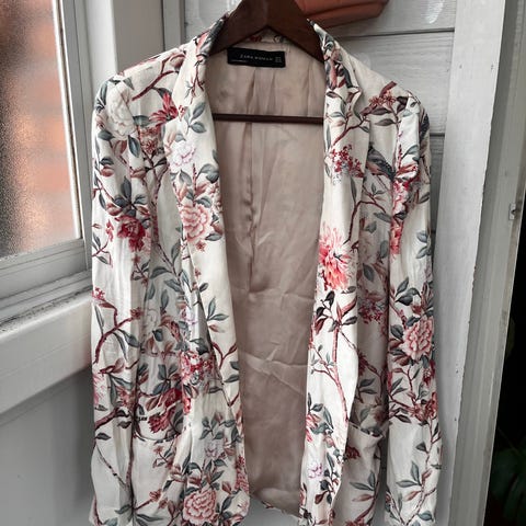 Zara blazer for dame i størrelse M. Blazeren er grå med fiskebensmønster og har en klassisk, rett passform. Materialet inneholder viskose, og innsiden er helfôret. Modellen har slag, én knapp i front og to frontlommer med klaff. Brukt en gang.