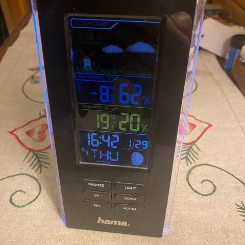 Det følger med trådløs utendørssensor som måler temperatur og sender data til hovedenheten. Sensoren drives av 2 x AA-batterier. Hovedenheten kan plasseres på bord eller hylle ved hjelp av utfellbare støtter på baksiden og strømforsynes via medfølgende strømkabel.