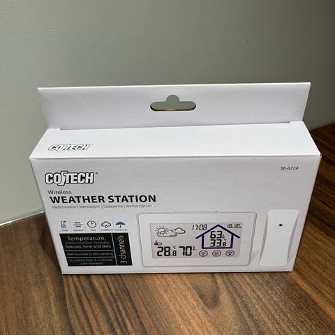 Værstasjonen viser innendørs- og utendørstemperatur, luftfuktighet og værikon på en bakbelyst fargeskjerm. Enheten har digital klokke og dato, samt tydelig inndeling mellom inne- og utedata.