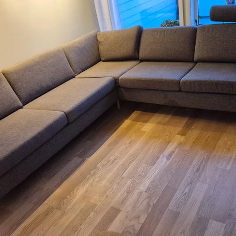 Selger en stilren og komfortabel hjørnesofa i lys grå velour. Sofaen er pent brukt og fremstår som svært godt vedlikeholdt. Den har kun vært brukt av to voksne og står i et røyk- og dyrefritt hjem.