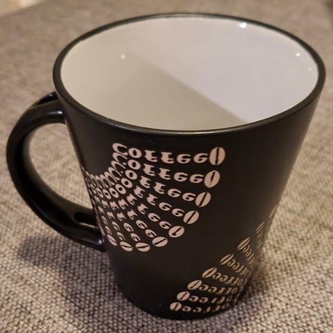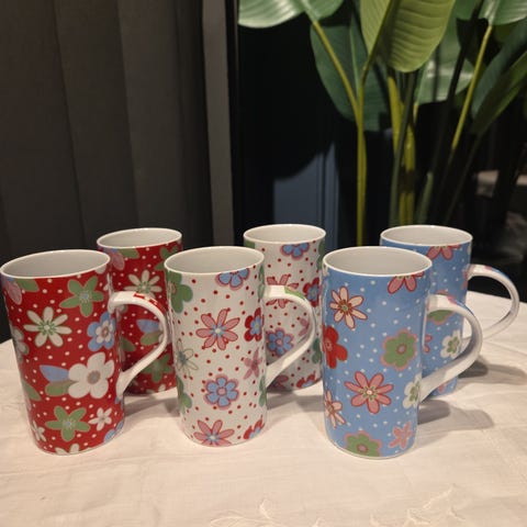 6 krus med hvit hank og hvite på innsiden og sølv på utsiden.skål som er hvit og sølvstriper.