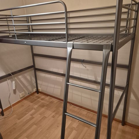 Noen synlige riper på øverste sengekant, se bilde. En flekk med mørk interiørbeis nederst ved stigen, kan males over.