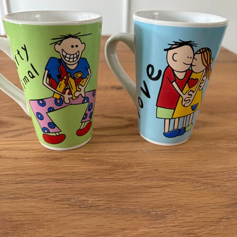 To fine krus, blanke og uten bruksspor. Fremstår som nye. Det eneste å bemerke er en bitteliten klump i glasuren fra produksjonen bak på det ene. Se detaljbilde.