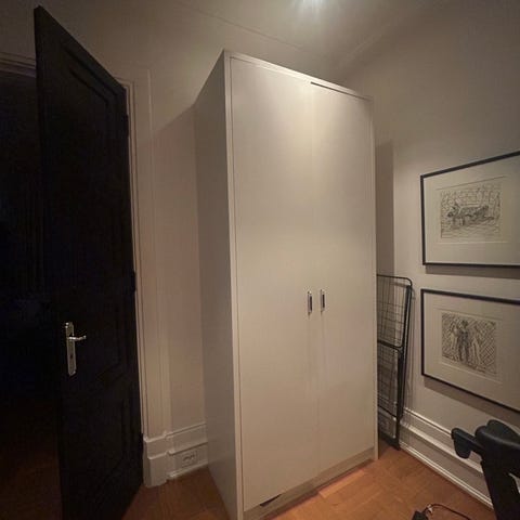 Skreddersydd garderobe med smart oppbevaringsløsning. Plass til både lange og korte hengende klær, og flere skuffer og skap. Den vil bli demontert, og du må hente delene og sette dem sammen selv.