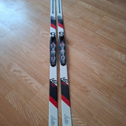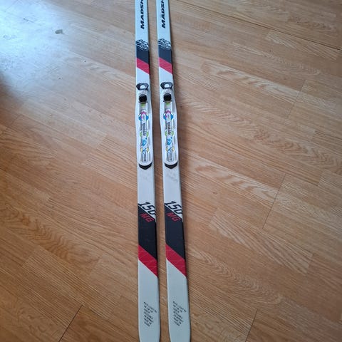 Smørefrie Madshus langrennski 150 cm. En del riper i sålen og en liten bit av framdelen av den ene bindingen har falt av (se bilde), men bindingen fungerer normalt. Har prøvd å fjerne navn som var skrevet på med sprittusj over bindingene, men får ikke fjernet det fullstendig. Må hentes