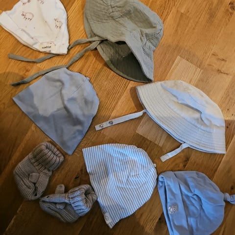 Luer og solhatt passende til ca 1 år/1,5 år. Solhattene har str 49. De er begge noe solbleket, selges derfor billig.