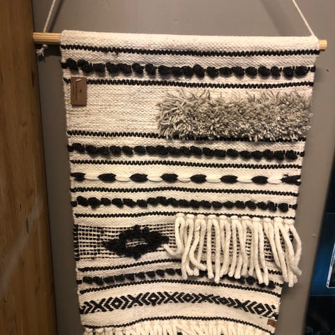 Ferdiglagd gulvteppe, som jeg kjøpte ny og gjorde om til veggteppe. Lagd frynser nederst på teppet, samt laget et oppheng. Opphenget gjør at teppet henger fint på veggen.