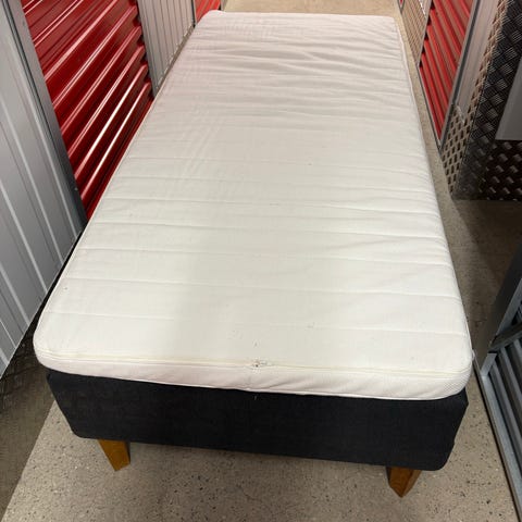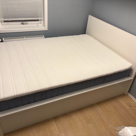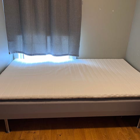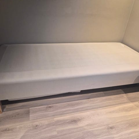 Jensen rammemadrass (norsk kvalitet) enkeltseng i lys nøytral farge. Sengen består av en rammemadrass med bein og en overmadrass. Passer som enkeltseng på soverom, gjesterom eller barnerom.