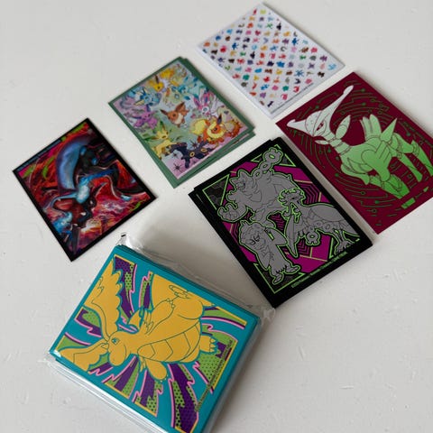 Selger et sett med 4 klistremerker av Mega lucario, Mega gardevoir, Mega latias og Mega mawile + en mini binder til å ha Pokemon kort i, med samme motiv. Helt nytt, aldri brukt.