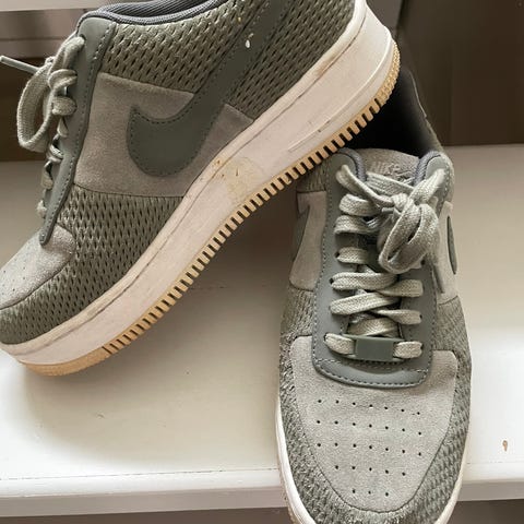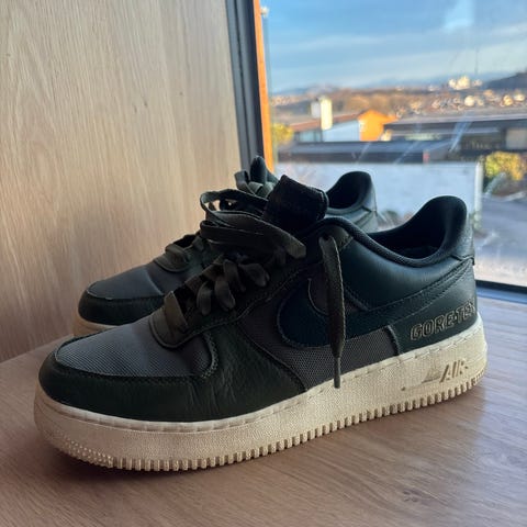 Nike Air Force 1 Gore-Tex sneakers i størrelse 40. Modellen har lav profil med snøring og overdel i grønn tekstil og syntetisk materiale. Skoene har Gore-Tex-merking på siden. Yttersålen er i gummi med brun farge. Egnet som fritidssko og hverdagsbruk. Skokrem medfølger.